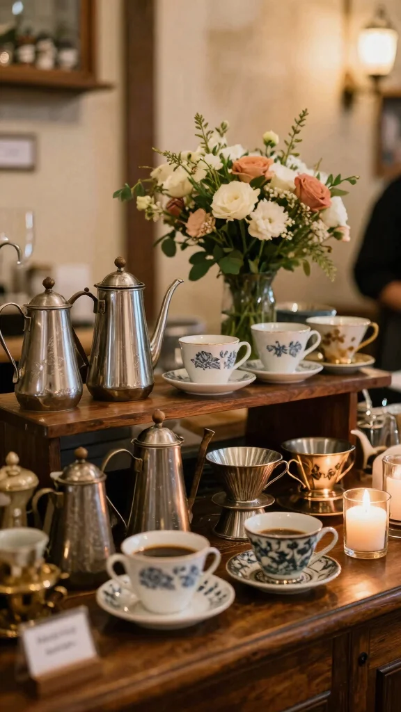Incorporate these vintage pieces throughout your coffee bar or create a dedicated vintage area. Enhance the setup with fresh flowers and candles for an inviting ambiance.