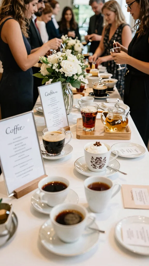 Place the tea options beside the coffee bar, offering brewing methods like loose leaf or tea bags for variety. Add little tags with tasting notes or pairing suggestions to enrich the experience.