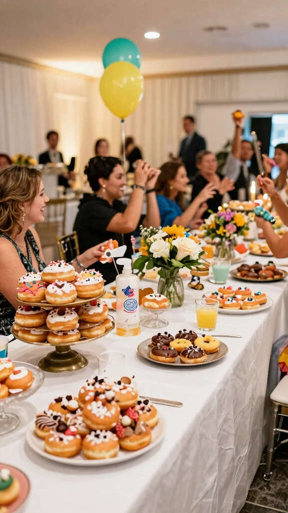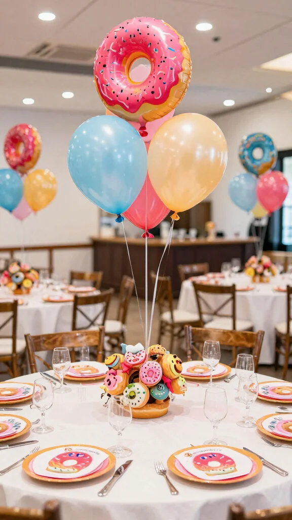 Think about using donut-shaped decorations, such as balloon garlands, cake toppers, or even donut-print tablecloths. These fun elements create a festive atmosphere that ties everything together beautifully. You can also include donut motifs in your signage, menus, and other printed materials!