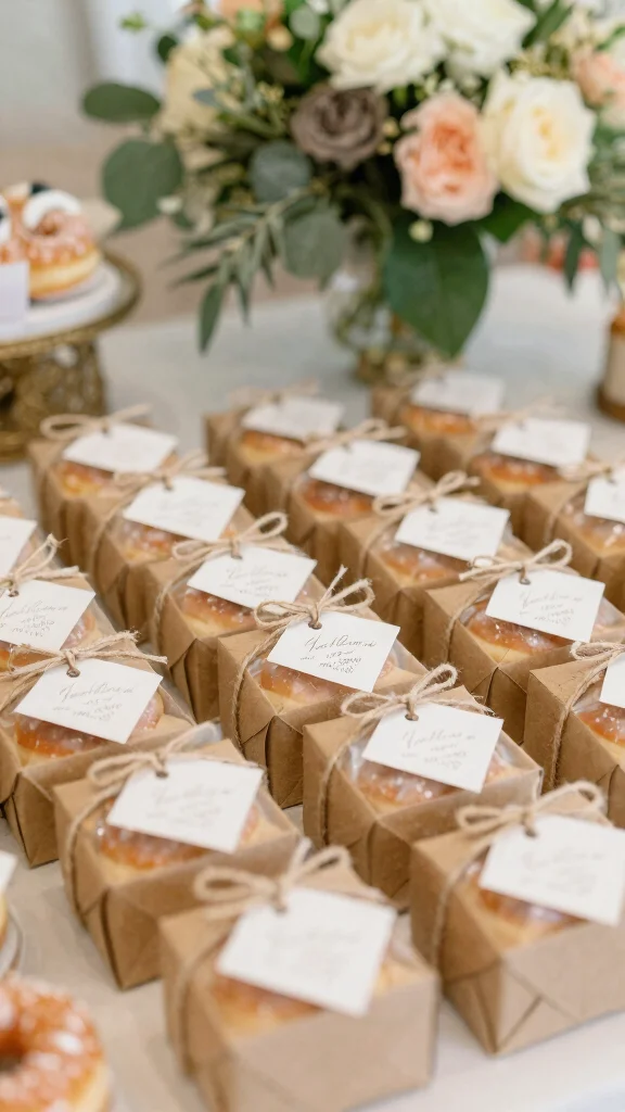 Looking for a sweet way to thank your guests? Donut wedding favors are a delightful choice! These treats can be beautifully packaged in small boxes or bags, reflecting your wedding colors and personal style. Consider bundling signature donuts or opting for mini donuts for an extra charming touch.