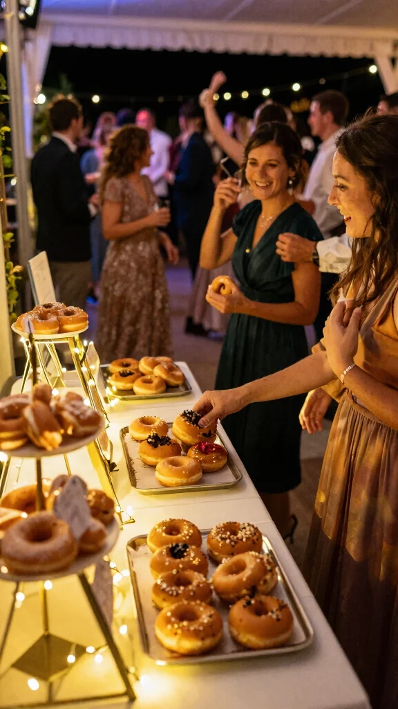 Consider offering specialty donuts like hot cinnamon sugar or fresh glazed ones right from the fryer. You might even set up a mini station for guests to grab and enjoy while dancing the night away, satisfying those late-night cravings and adding an element of fun.