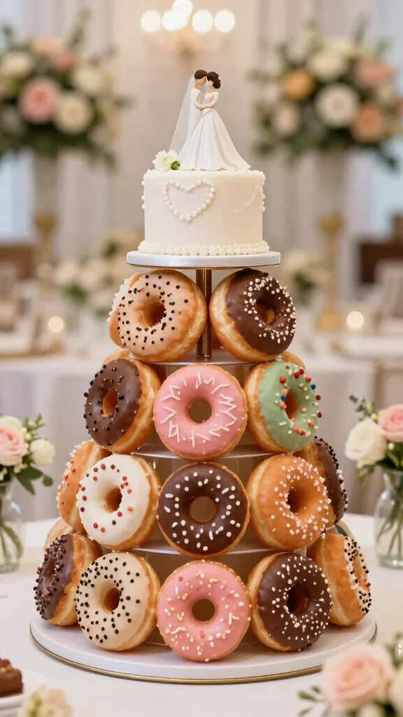 For couples seeking a fun alternative to traditional wedding cakes, consider a donut cake! Stacking donuts in a cake-like display creates a whimsical centerpiece and offers a delicious treat for guests. You can even have a small traditional cake on top for cutting while showcasing an array of donuts underneath.