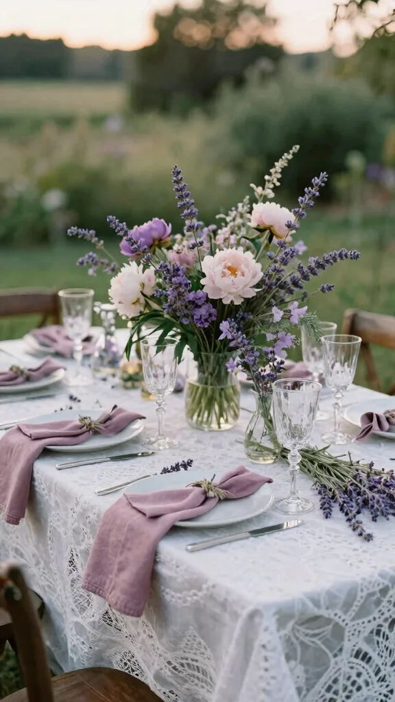 To enhance the ethereal vibe, think about adding lavender touches in napkins or place cards. This combination shines in both outdoor and indoor settings, reflecting a serene yet romantic theme. Incorporating natural materials like wooden tables and flowing fabrics can elevate the bohemian feel you’re aiming for.