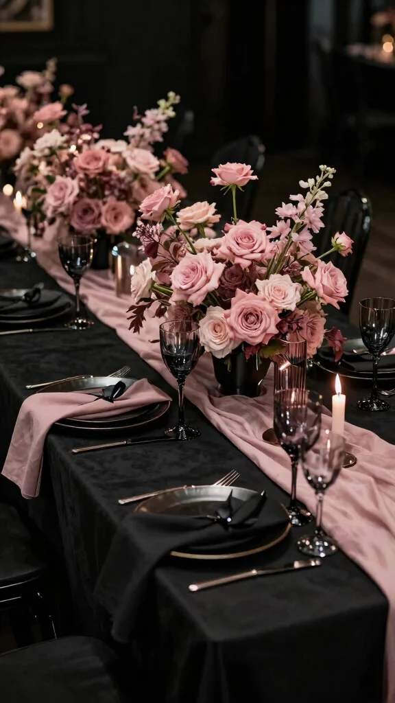 Incorporate black in your decor through table settings or attire, using dusty rose for floral arrangements and accents. This palette allows for unique design opportunities, such as black linens with dusty rose centerpieces.