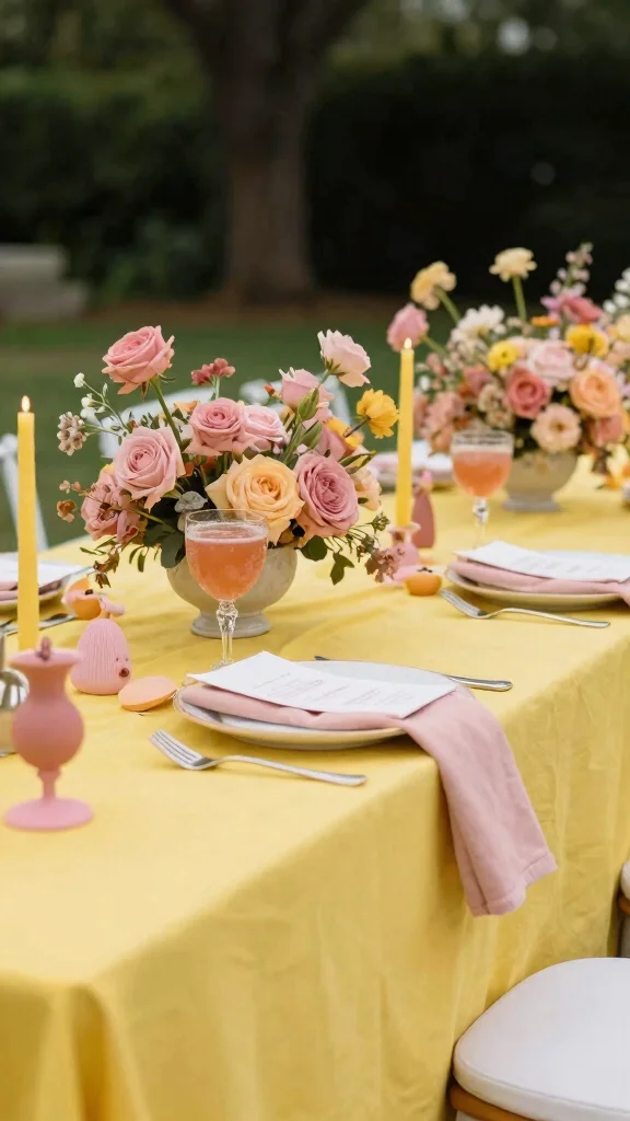 Incorporate bright yellow into floral arrangements, table settings, or fun decor items, while using dusty rose for linens or accents. This vibrant color scheme is perfect for outdoor celebrations where colors can truly shine.