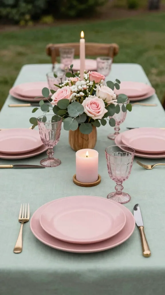 Incorporate sage green through tablecloths paired with dusty rose accents like candles and floral arrangements. Consider a floral design that combines roses, lush greenery, eucalyptus, and soft white blooms to enhance the calm and sophisticated vibe.