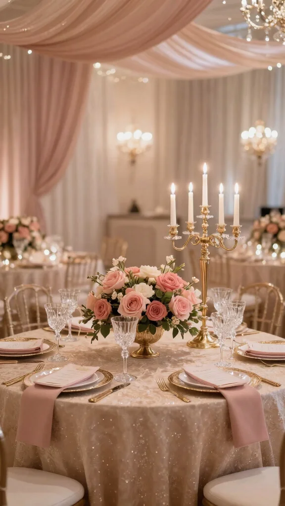 Think about using champagne-colored fabrics for your wedding dress or bridesmaids’ gowns, complementing them with dusty rose in your floral decor. Enhance this color scheme with touches of gold or rose gold accents, whether through metallic tableware or sparkling chandeliers overhead.