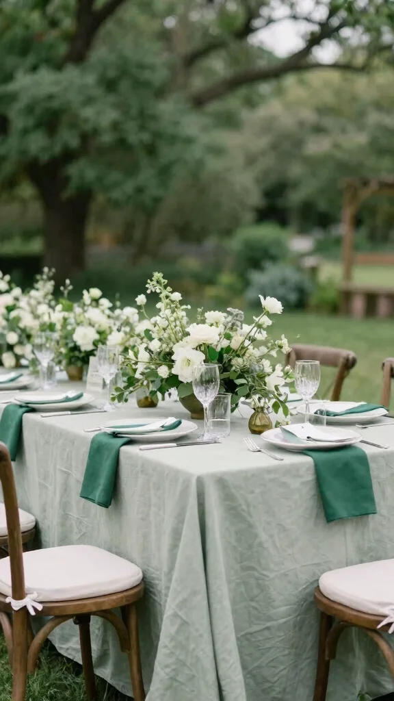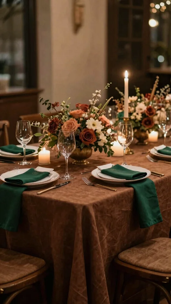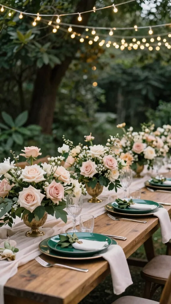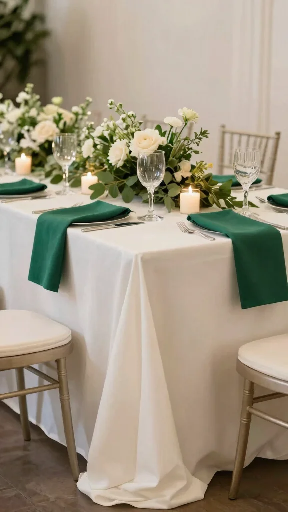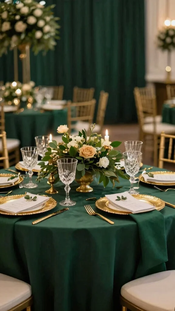 Set the mood with emerald plates accented by blush napkins, which lend an airy, charming feel to your reception. Soft fabrics like chiffon or tulle can further enhance this romantic vibe.