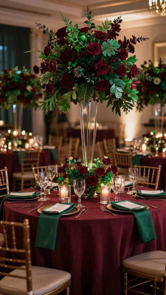 – Emerald accents in decorations for continuity