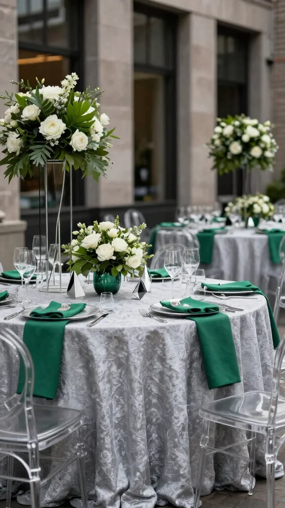 For a modern chic look, pairing emerald green with silver gray is a match made in heaven. This beautiful fusion creates a sophisticated yet contemporary vibe, making it perfect for urban weddings. Imagine sleek silver table settings adorned with emerald details and modern floral arrangements that captivate your guests’ attention.