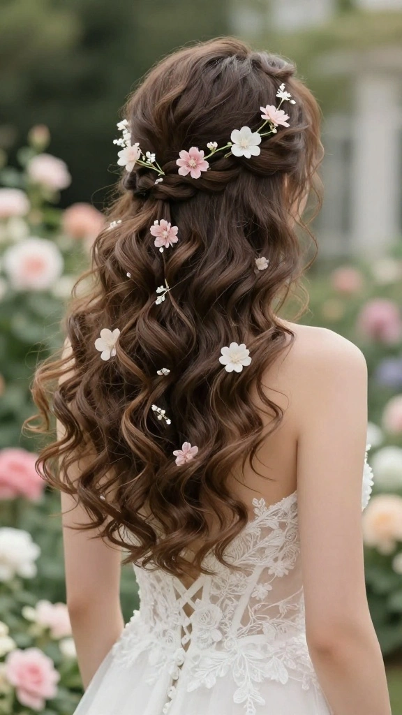 This style pairs beautifully with flowing dresses and natural makeup to create a timeless bridal look.
