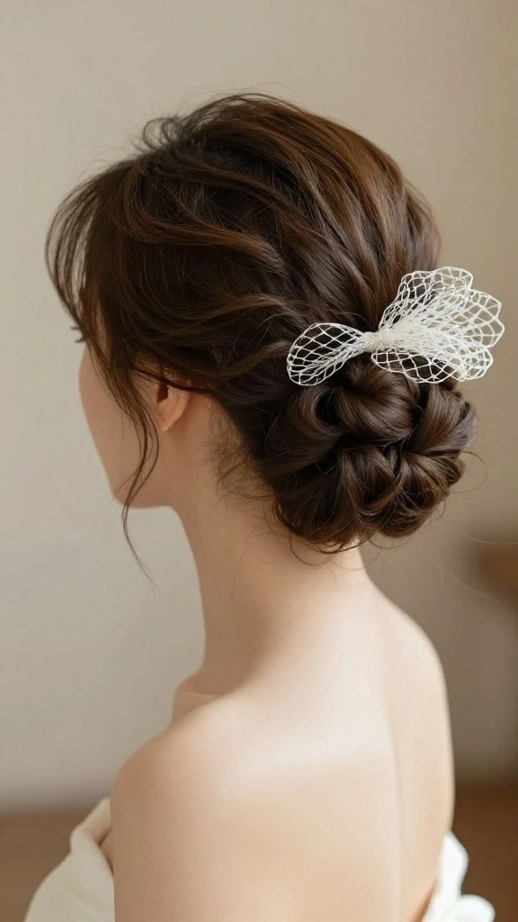 Introduce a unique twist to traditional bridal hairstyles with a textured updo embellished with vintage netting. This look combines vintage charm with modern elegance, perfect for brides wanting something distinctive. The textured hair adds volume, while the vintage netting introduces an element of sophistication.