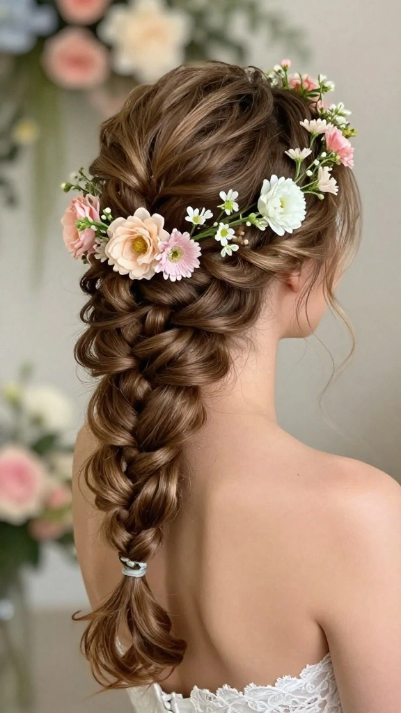 Infuse your bridal look with whimsy through a twisted braid adorned with a floral fascinator. This hairstyle embodies bohemian beauty, making it ideal for outdoor or garden weddings. The textured braid, coupled with soft waves, creates a stunning visual that resonates with nature’s charm.