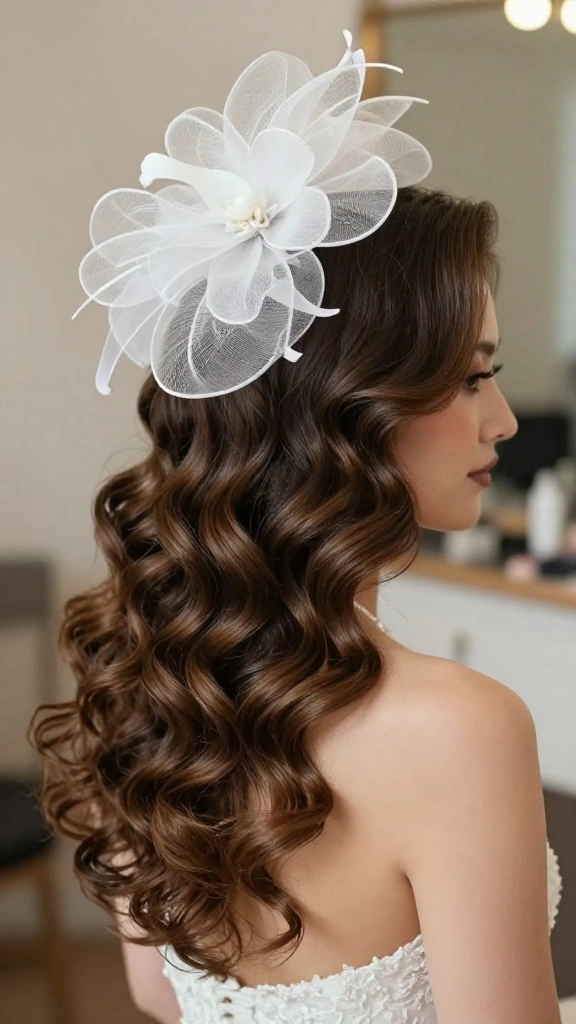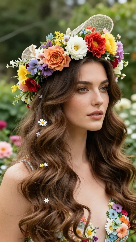 Embrace a whimsical, romantic vibe by combining a floral crown with a chic fascinator. This hairstyle is a celebration of nature and love, making it a perfect choice for outdoor ceremonies. The playful mix of blooms and elegant accents creates a stunning balance that feels fresh and enchanting.