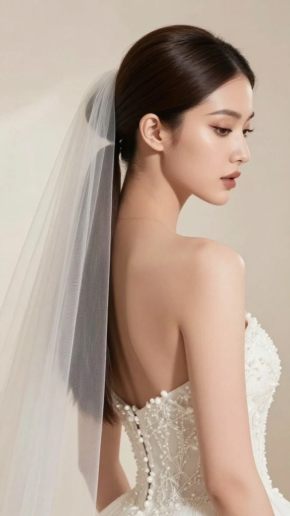 The long veil cascading down your back adds drama, making this look perfect for memorable moments.