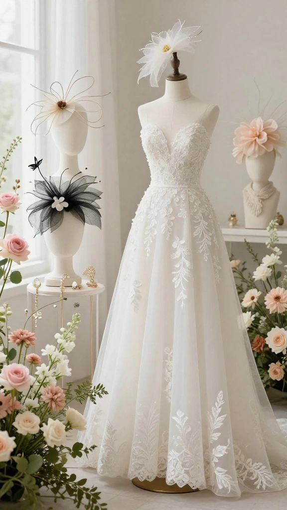 Your wedding dress can influence your fascinator choice. A strapless gown might pair well with a dramatic headpiece, while a dress with intricate details would benefit from a more subtle fascinator. Think about the neckline and embellishments of your gown. You want the fascinator to enhance your look without overwhelming it.