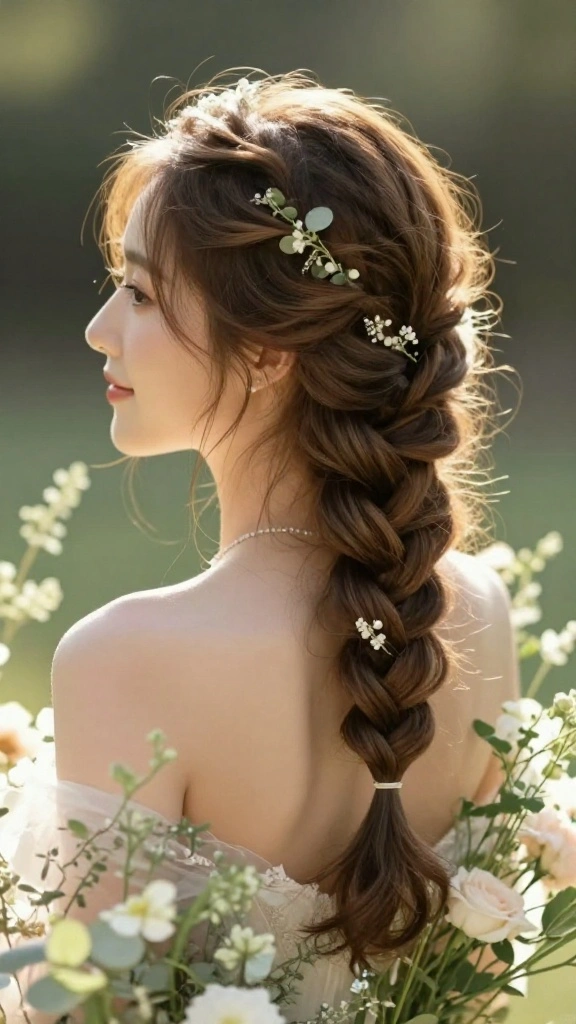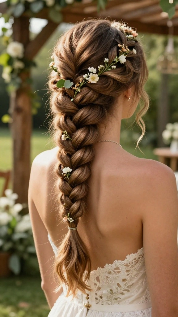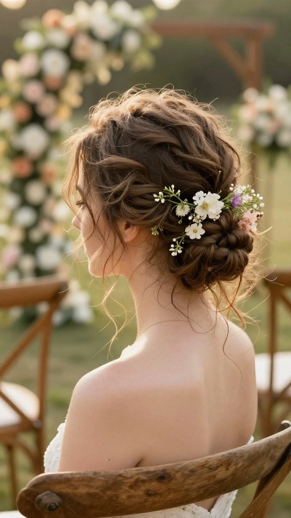 This hairstyle can be accessorized with small flowers or ribbons for a romantic touch, making it ideal for a bohemian-themed wedding.