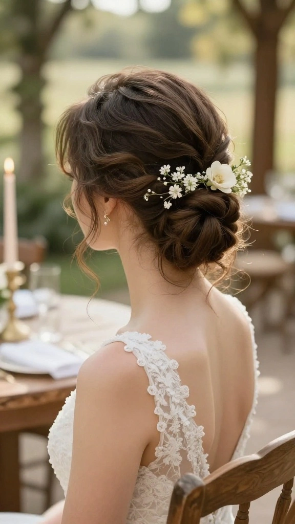 This hairstyle pairs wonderfully with floral crowns or delicate pins, enhancing the ethereal effect. It’s a perfect choice for outdoor ceremonies, bringing a romantic and whimsical feel.