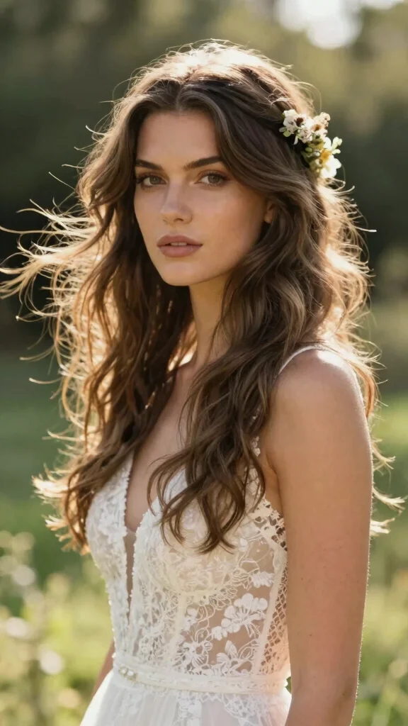 Beachy waves exude effortless beauty, making them a classic choice for bohemian hairstyles. Paired with a floral headband, this look is ideal for weddings by the sea or outdoor venues, capturing a relaxed yet chic vibe.