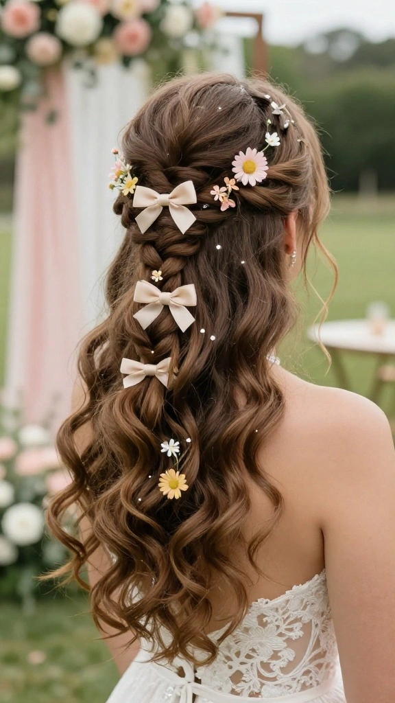 For a playful and charming look, the twisted half-up hairstyle with bows is a delightful choice. This style is perfect for brides wanting to embrace their youthful spirit while retaining elegance.