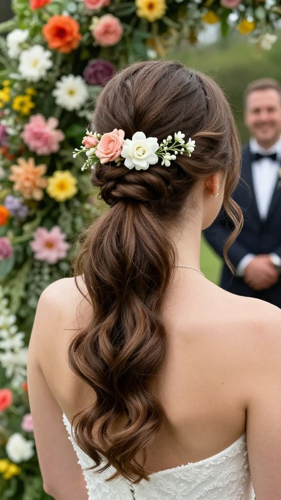 This hairstyle is not only adorable but functional, keeping hair away from your face while allowing for beautiful movement. It pairs beautifully with floral elements that complement the wedding theme.