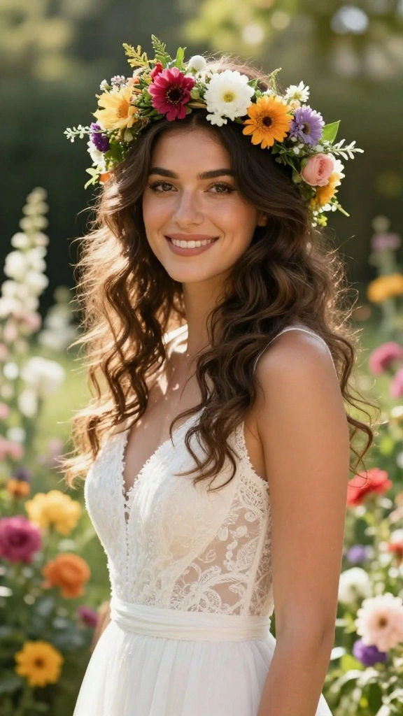 For a dreamy and romantic look, long layers paired with a flower crown create a stunning hairstyle. This option is perfect for brides who wish to embrace their long hair while adding whimsical floral accessories.