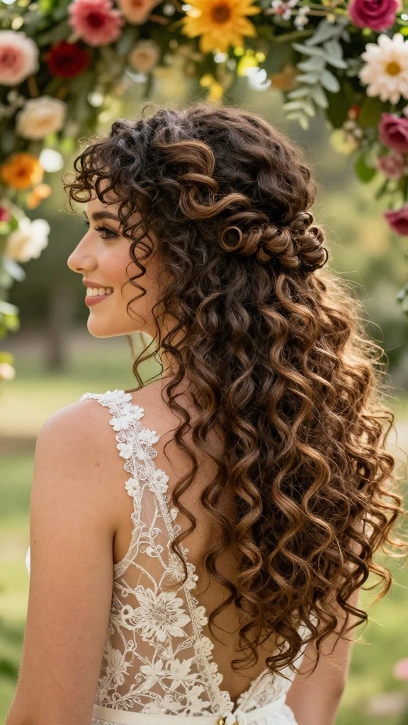 For brides with curly hair, a bohemian curly updo is a beautiful choice showcasing your natural texture. This hairstyle is elegant yet fun, allowing for a free-spirited vibe perfect for outdoor ceremonies.