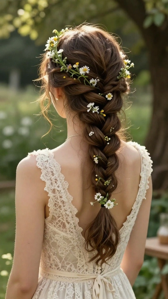 This hairstyle is enchanting, echoing the beauty of the wild outdoors. Choose flowers that match your style for a personalized touch, making it perfect for any bohemian wedding.
