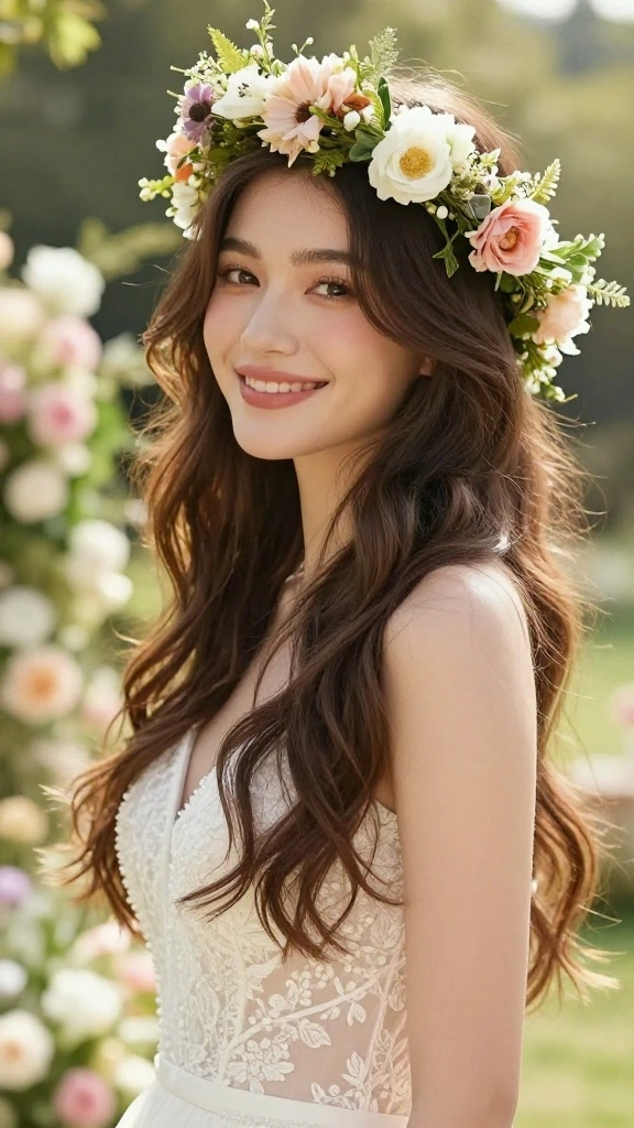 This hairstyle is not only breathtaking but also versatile, allowing for adjustments to fit your personal style. The combination of flowing hair and a flower crown creates an enchanting look, perfect for capturing timeless wedding photos.