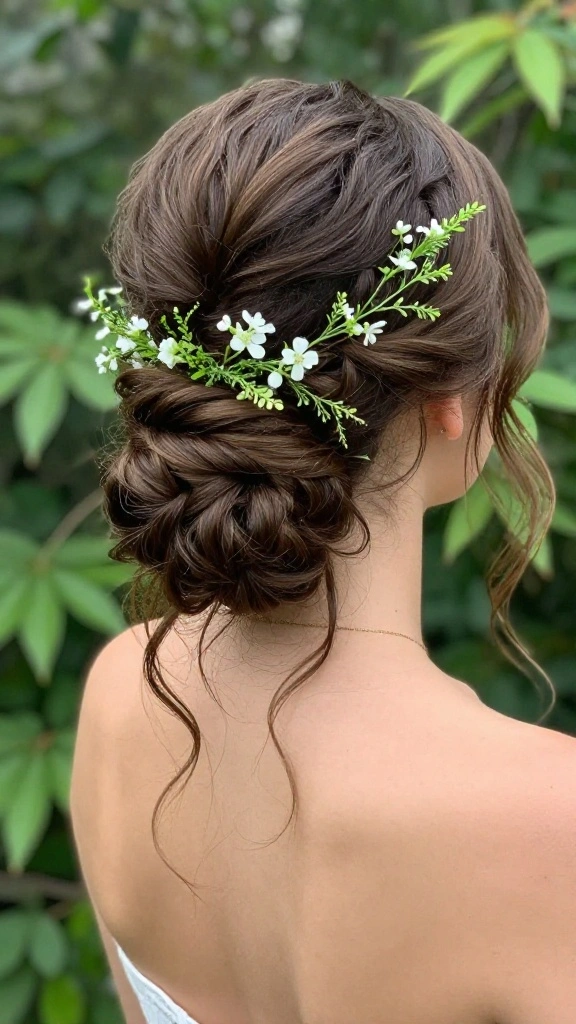 The twisted updo is a sophisticated hairstyle that merges elegance with a bohemian touch. By incorporating greenery, this style beautifully complements outdoor settings, bringing in a refreshing essence of nature.