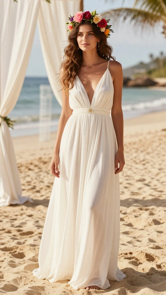 This hairstyle not only looks stunning but is also practical for hot summer days. The floral headband adds a playful touch, making it perfect for outdoor ceremonies and beachside events.