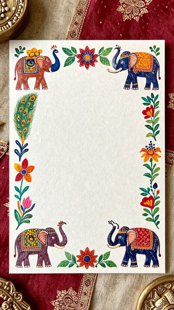 For those who adore bold colors, vibrant Rajasthani patterns can bring your wedding invitations to life. Picture rich reds, oranges, and blues adorned with elephants, peacocks, and mandalas that showcase the vibrant culture of Rajasthan. This design is perfect for lively celebrations, embodying the spirit of Indian heritage.