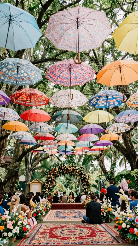 – Get inspired with unique elements like hanging floral installations and colorful umbrellas that elevate your wedding’s aesthetic.