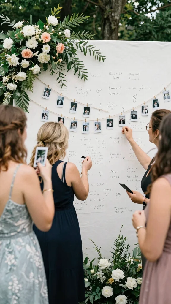 Engaging your guests in the decor can add a memorable touch to your wedding. Create an interactive backdrop where guests can leave messages or photos, such as a large canvas for well-wishes or a photo booth framed with beautiful greenery and flowers.