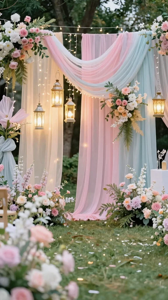 Craft a dreamy backdrop that transports guests to a fairy tale world. Combine elements like soft pastel colors, flowing fabrics, and twinkling lights to create a magical atmosphere. Incorporate natural elements like flowers and greenery along with whimsical decor such as fairy wings or enchanted lanterns.