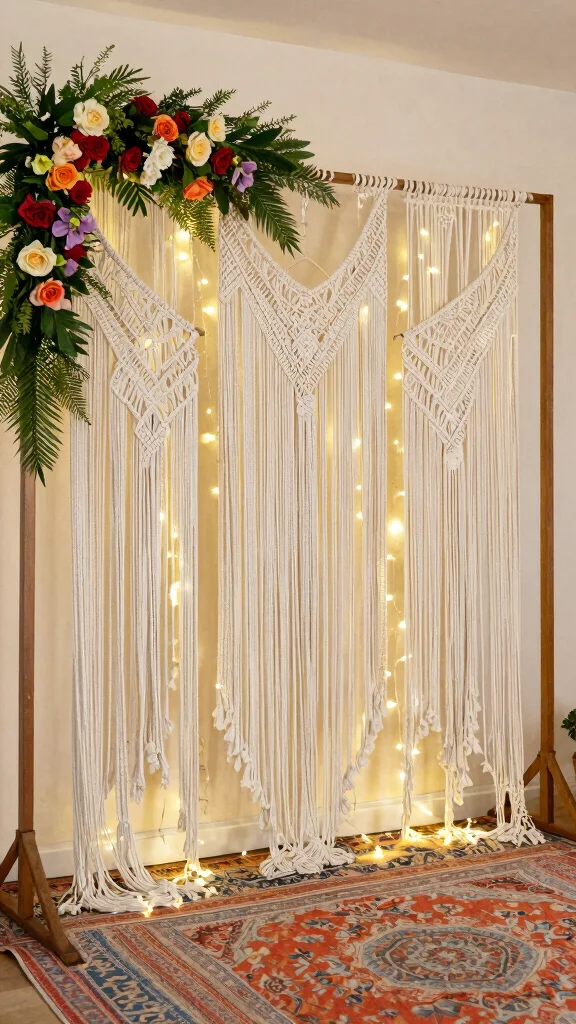 Hang macramé pieces from a wooden or metal frame, and pair them with vibrant flowers and greenery for a striking visual display. This unique backdrop works beautifully in both indoor and outdoor settings, adding warmth and character.