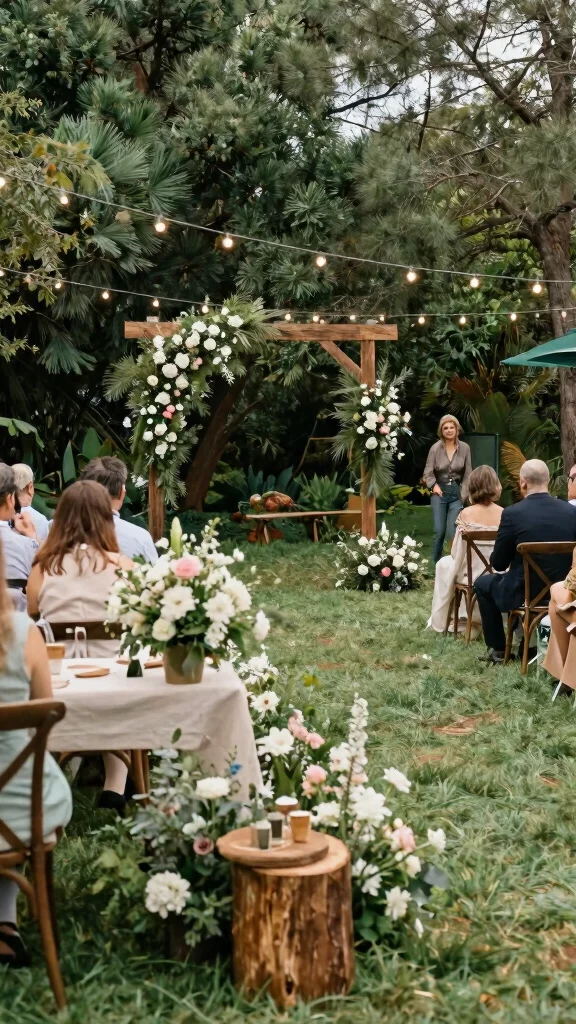 To enhance the evening ambiance, consider adding solar-powered lights or lanterns. Using nature-inspired fabrics for draping can complete the eco-friendly theme beautifully.