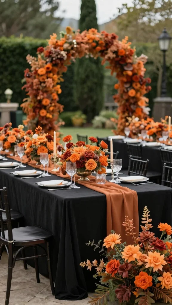 – Use black tablecloths with burnt orange arrangements for elegance.