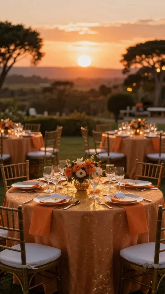 Incorporate gold chargers with sunset orange napkins for an elegant table setting. Consider using gold lighting elements like chandeliers or string lights to enhance the atmosphere. Offer sunset-inspired cocktails to create a themed drink option for your guests.