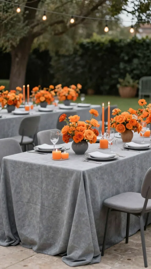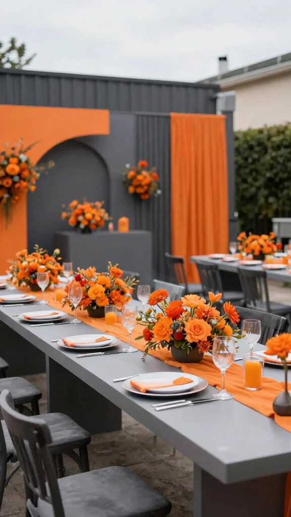 For an energetic and modern vibe, bright orange paired with charcoal gray makes a bold statement. This combination is perfect for contemporary outdoor weddings, creating a striking contrast between vibrant orange and smoky gray. Picture bright orange flowers set against gray linens for stunning centerpieces that pop.
