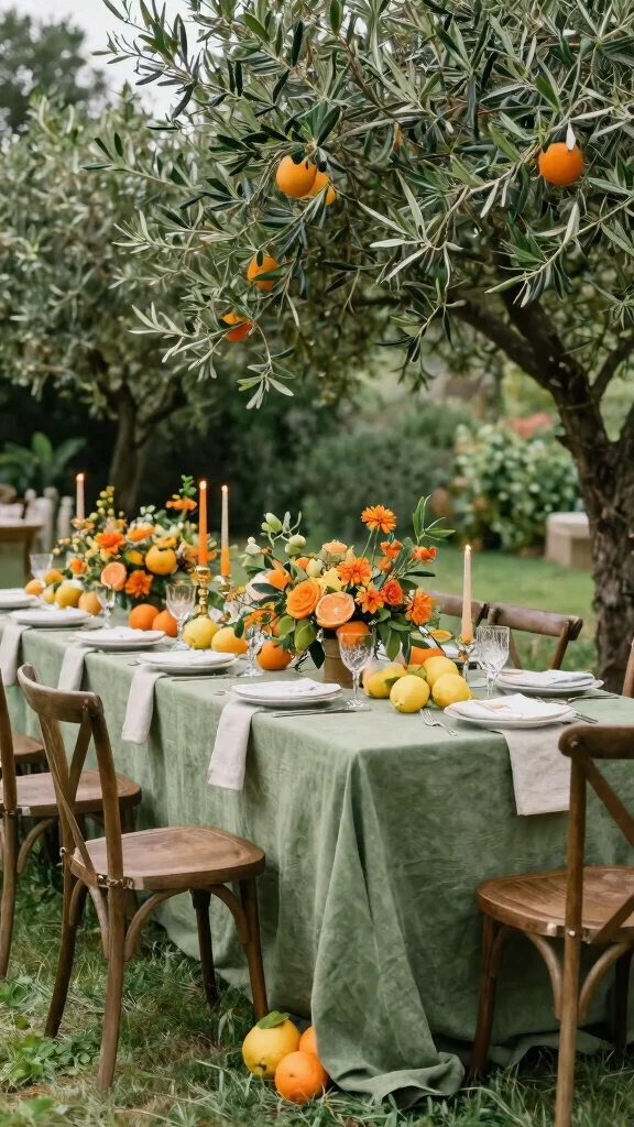 Consider using fresh citrus fruits like oranges and lemons as part of your decor to add a unique touch. Offer guests bottles of fresh olive oil as favors, enhancing that earthy theme. Incorporate wooden tables or olive branches in your floral arrangements for added charm.