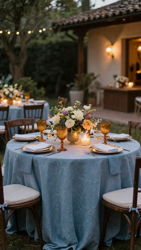 Incorporate amber lighting to create a magical glow throughout your evening celebration. Dusty blue bridesmaid dresses paired with amber jewelry can create a chic coordination. Choose unique glassware in amber and blue to enhance your table settings.