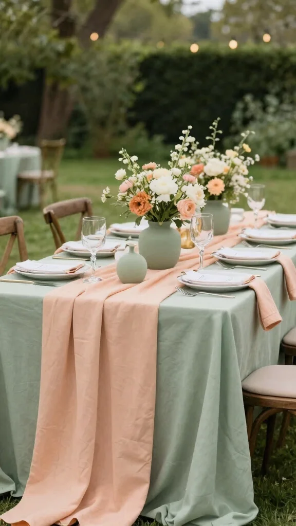 Choose light, airy fabrics to enhance the soft color scheme throughout the venue. Consider serving apricot-inspired desserts to keep the theme consistent. Incorporate sage green accents in your invitations and signage for a cohesive look.