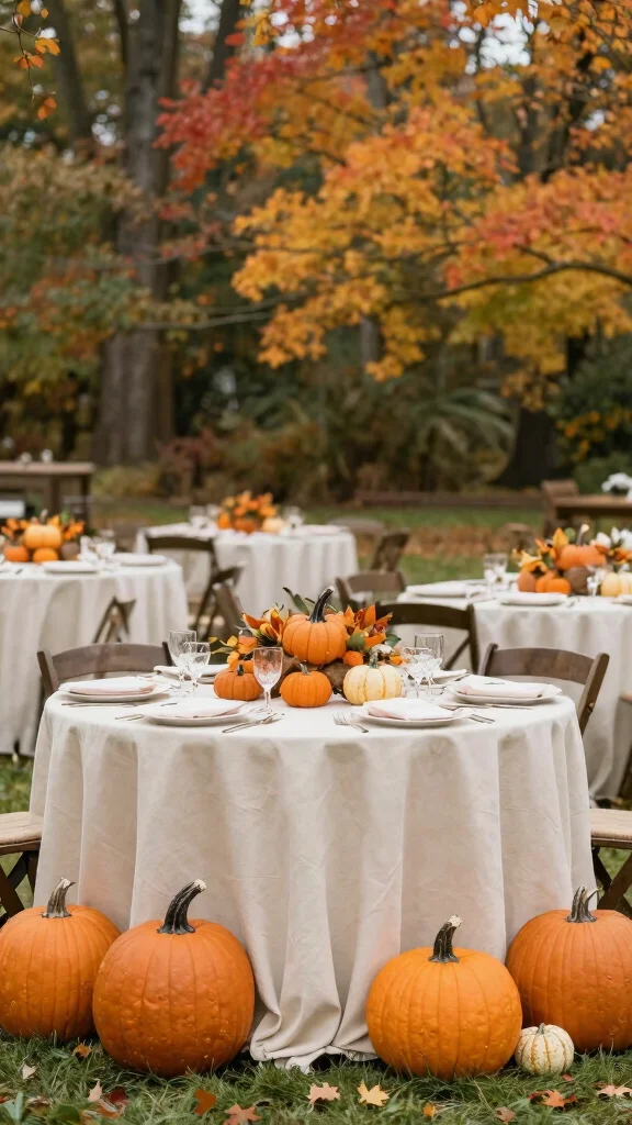 Opt for cream table settings accented with pumpkin spice details to enhance the theme. Consider serving pumpkin-spiced treats or cocktails during the reception for a seasonal touch. Create cozy seating areas with cream and orange cushions that invite guests to relax.