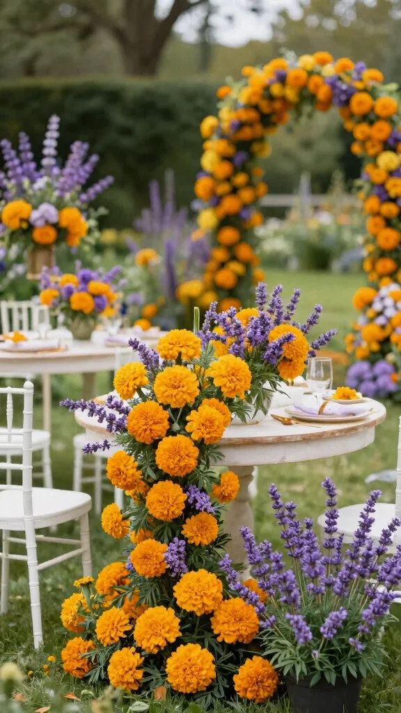Incorporate marigold and lavender themes throughout your table settings for a cohesive look. Consider lavender sachets or marigold seed packets as wedding favors for a charming touch. Enhance the sensory experience with lavender-infused candles for a delightful aroma.
