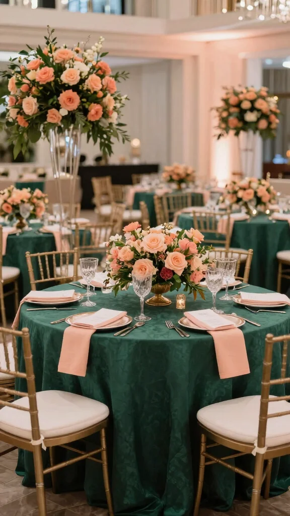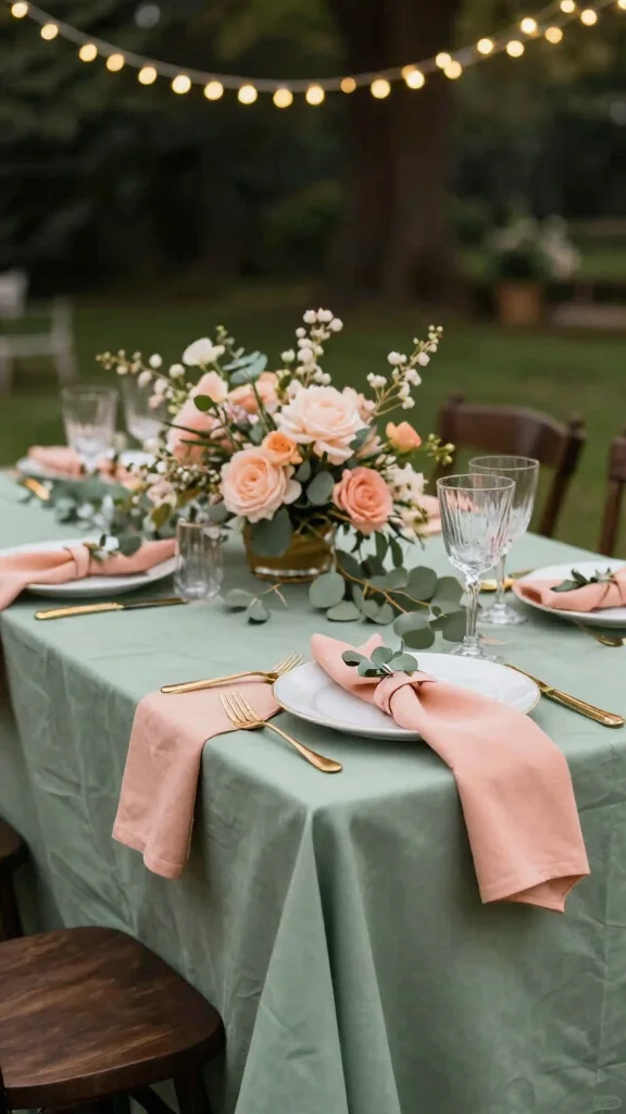 Start by adding touches of gold in your decor to introduce a bit of sparkle. Incorporate sage green foliage within your floral arrangements for a cohesive look. Using peach napkins at your reception tables can further tie in the color scheme effortlessly.