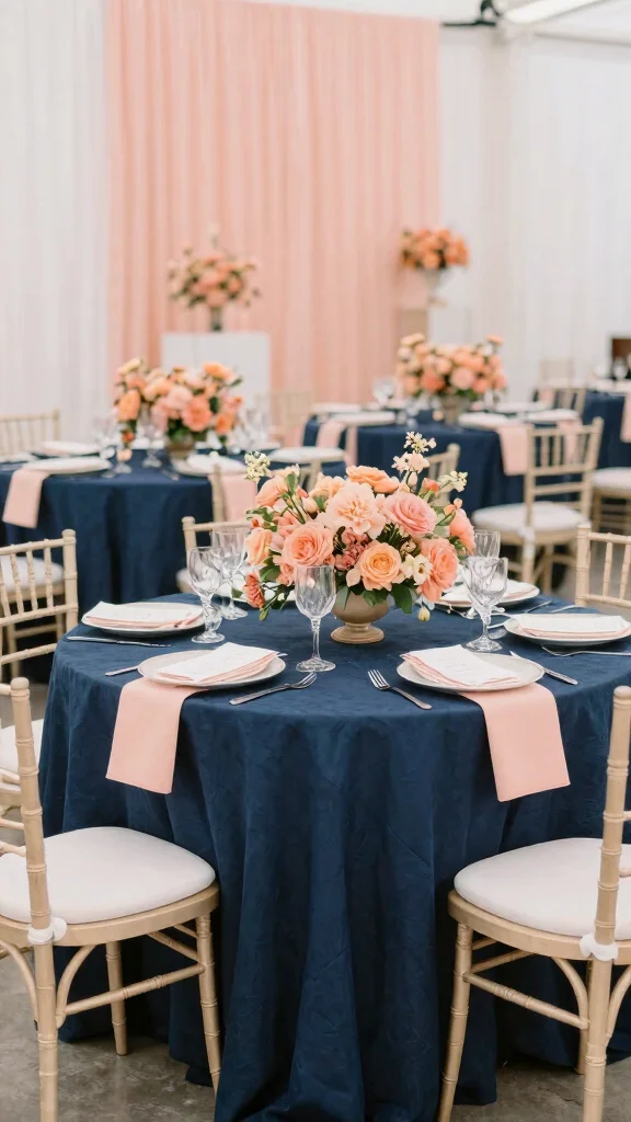 Incorporate navy blue bridesmaid dresses with peach bouquets for a modern twist. Use navy accents in your table decor or invitations to enhance the overall design. This palette is bold and beautiful!