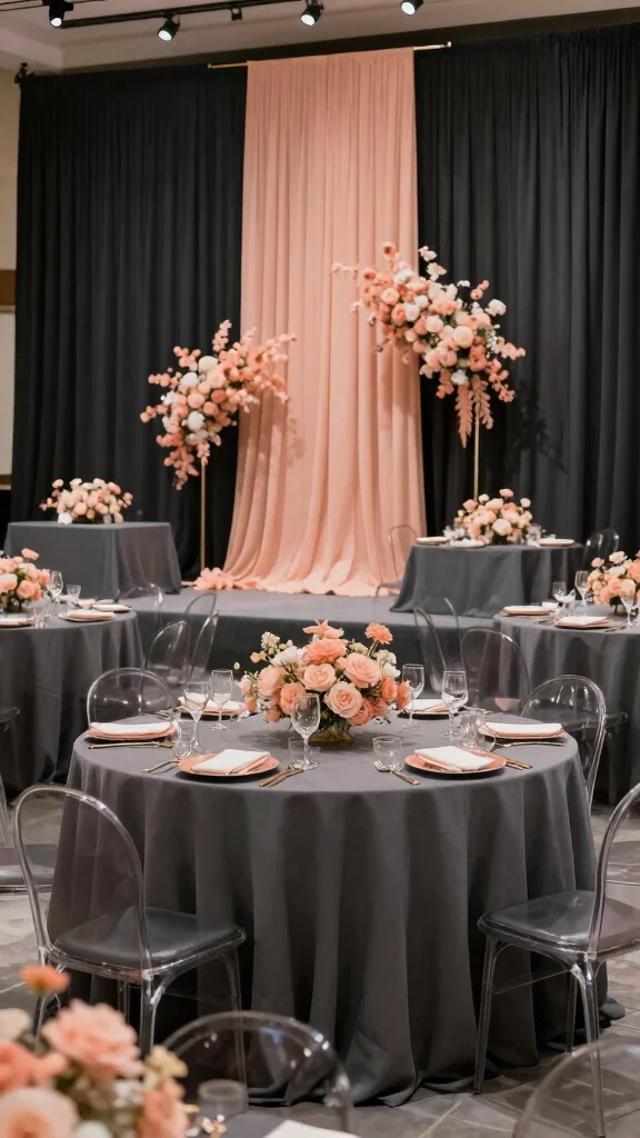 Incorporate charcoal elements into your wedding cake or table decor for added depth. Use peach accents in your signage or floral arrangements for a polished effect. This palette is chic and contemporary!