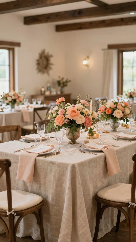 Use beige linens with peach centerpieces for a cozy touch. Incorporate rustic elements into your table settings to enhance the theme. This palette is warm and welcoming!