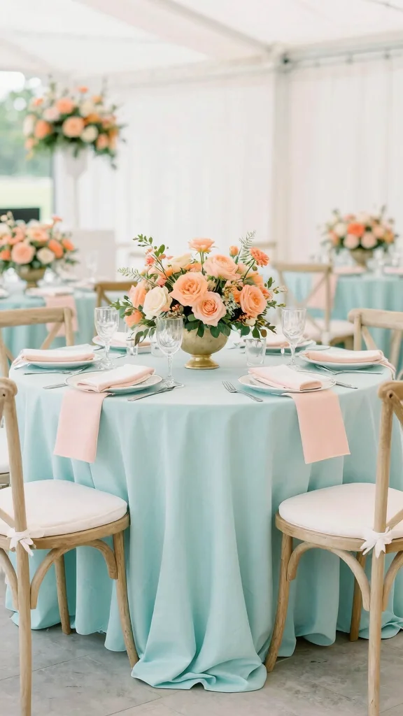Mint green paired with peach creates a fresh and vibrant aesthetic, making it perfect for spring or summer weddings. This combination evokes feelings of renewal and freshness. Imagine mint-colored table settings adorned with beautiful peach florals for a charming effect.